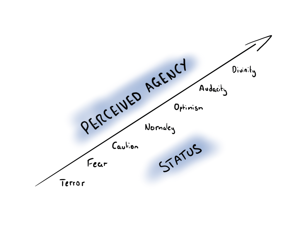 In a state of fear, perceived agency is significantly curtailed. In a state of caution, it is affected in a minor way. The state referred to as normalcy is where we are ninety percent of the time: we have agency but we are liable to be influenced, too. In a state of optimism, we feel ourselves to be the captain of our ship, albeit with a willful crew. In a state of audacity, we feel ourselves to be masters of our fate.