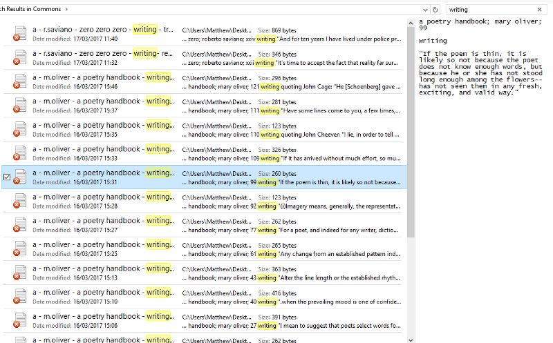 Well first, that is aided by how I structure the content and file names. But however you do it, it’s worth keeping this in mind: you can only search what you write down. So if I include the author’s name in either the content or file name, I can find it later by conducting a simple search. And this works for specific words, specific categories, notes on a particular author or book, whatever.